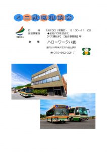 【ハローワーク八鹿】ミニ就職相談会のお知らせ「全但バス 株式会社」 2026.01.08 お知らせ 【ハローワーク八鹿】ミニ就職相談会のお知らせ「全但バス 株式会社」 ●日 時:令和8年1月15日(木) ●ハローワーク和田山:9時30分~11時00分 ●募集職種等の詳細は下記チラシをご確認ください。 全但バス_ミニ就職相談会_1月15日()(木) 株式会社タクマテクノス会社説明会