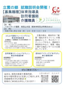 【ハローワーク和田山】「立雲の郷」支援員募集のお知らせ 2026.01.08 お知らせ 立雲の郷 就職説明会開催のご案内です。 立雲の郷 就職説明会 1月22日(木) ご興味のある方は、下記問い合わせ先までご連絡ください。 【問い合わせ先】 ハローワーク和田山 ☎079-672-2116