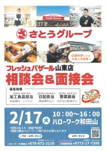 【ハローワーク和田山】さとうグループ フレッシュバザール山東店 相談会&面接会 ●日 時:令和8年2月17日(火) ●ハローワーク和田山:10時00分~16時00分 ●募集職種等の詳細は下記チラシをご確認ください。 さとうグループ フレッシュバザール山東店 相談会&面接会