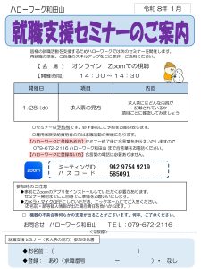 ハローワーク和田山から、就職支援オンラインセミナーのご案内 1月28日です。 詳細は下記のチラシを参照してください。 【ハローワーク和田山】就職支援オンラインせまなーのご案内 1月28日 ご興味がある方は下記問い合わせ先までご連絡ください。 【問い合わせ先】 ハローワーク和田山 ☎079-672- …