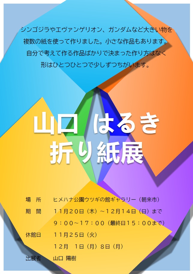 ヒメハナ公園ウツギの館では、「山口 はるき 折り紙展」を開催します。